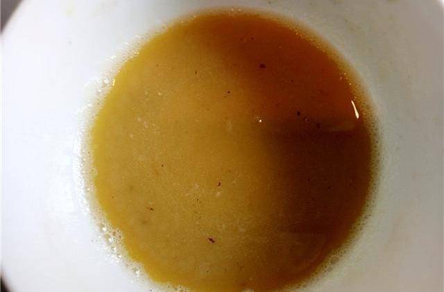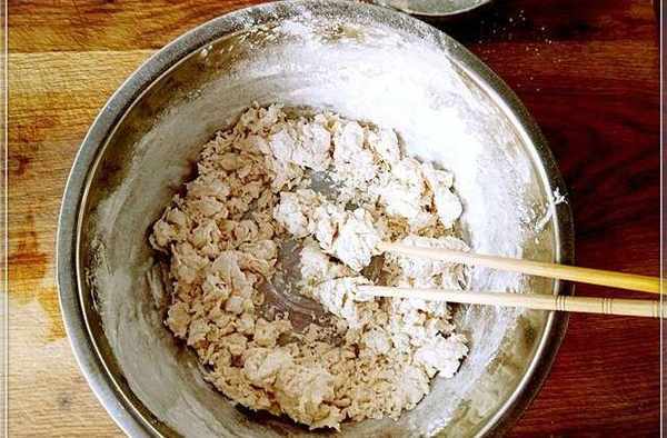 取碗,加入面粉適量,淋上燒好的蔥油,加入適理十三香和鹽,攪拌均勻。這是是制作蔥油包餅的關鍵技術。