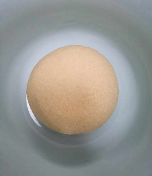 邊倒酵母水、邊攪拌面粉,直到面粉呈絮狀,上手揉成稍硬適中的面團。