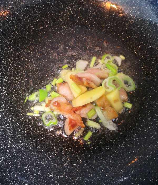 肥肉切小塊,熱鍋涼油,倒入肥肉,煸炒出肉油後,倒入蔥、薑小火炒出香味。