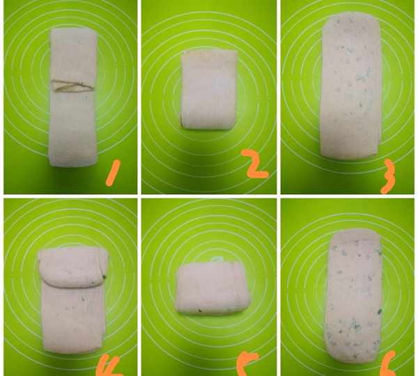 1-3:折疊三分之一,再翻折,繼續搟薄、搟長。