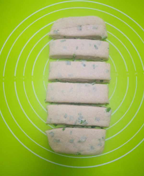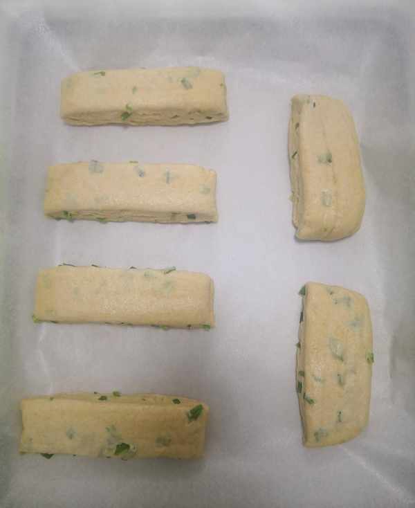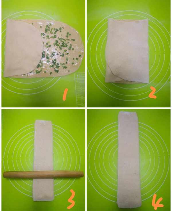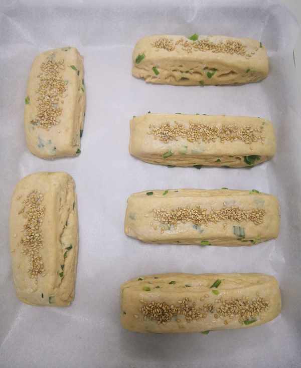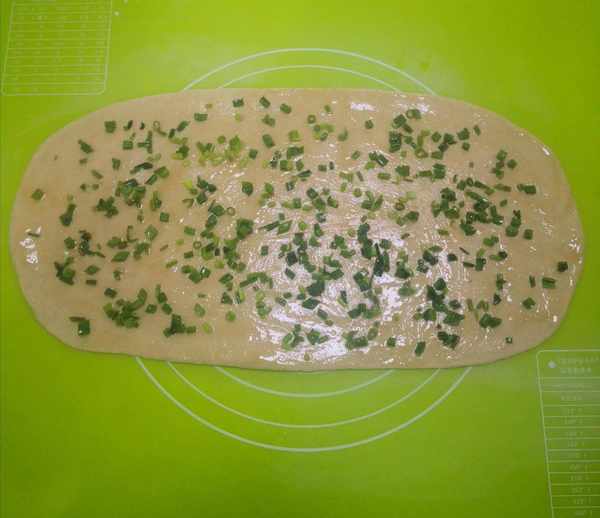 搟成一兩毫米厚的長方形薄片,刷上稀油酥、撒點蔥花。