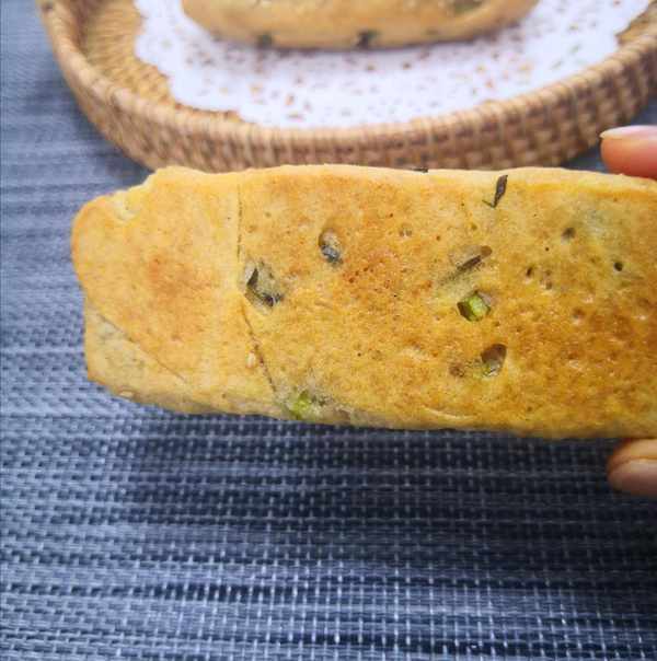 4.這款烤全麥蔥餅還可以用平底鍋加蓋烙至兩面變焦後加大半碗水,繼續烙至水幹後,再關火燜5分鐘,平底鍋烙得也很好吃。