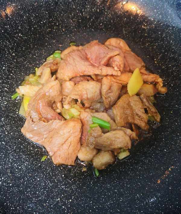 豬肉肥瘦分離,瘦肉切薄片,加鹽、生抽、少許老抽抓拌均勻醃制20分鐘。