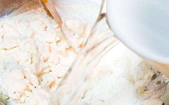 1、首先我們先在面盆當中放入適量的面粉,然後再準備適量的水,水和面的比例最好是9:20,這樣做出來的面團才能夠做到不粘手。