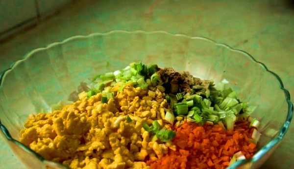 準備一顆大白菜,將白菜洗凈,用刀先拍幾下,先切成白菜條,再切成白菜丁,將切好的白菜丁放入盆中,加一勺鹽,加鹽都是為瞭逼出白菜中的水分,用筷子攪拌均勻後醃制十分鐘,準備一根清洗幹凈的胡蘿卜,先切成條,再切成丁,另取一個小碗,碗中打入三顆雞蛋,用筷子將雞蛋充分打散,熱鍋放油,油溫低一點的時候就將蛋液倒入鍋中,用筷子不停攪拌,攪拌成雞蛋碎,炒好後盛到盤子中晾涼,再準備一小把煮好的粉條,將粉條切碎。