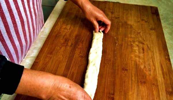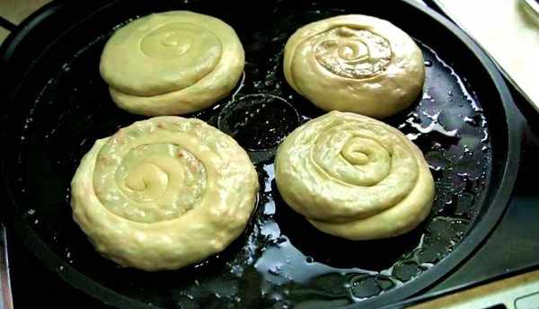 醒好的面團取出,在案板上抹上油,做成油案,再將面團放到案板上,用手按扁,再用搟面杖將面團搟成一個長方形的面皮,中間放上適量的餡料,先從上往下折,再從下往上折,用手邊拉伸,邊輕輕的摔打幾下,讓它變得更長一點,再從一頭邊拉伸邊卷起來,收尾處放在底部,用手輕輕壓成圓餅。