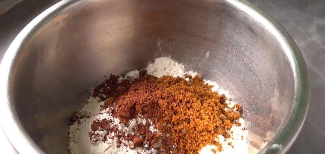 先混合所有幹料。在普通面粉中加入紅糖,可可粉。可可粉是用來調色的,沒有的話可以省略。