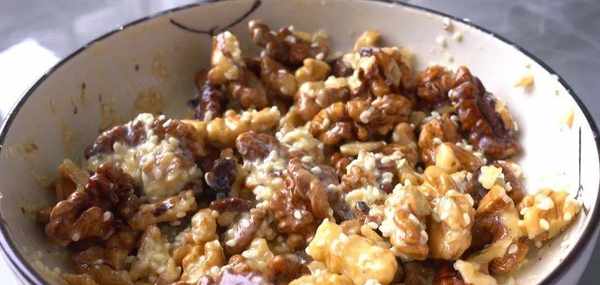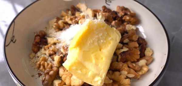 拌好之後的核桃表面油光油光的,色澤很好看。可以用豬油代替黃油。