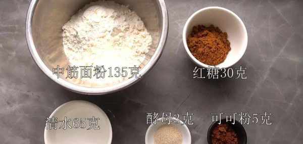 這是做包子皮需要準備的材料:中筋面粉135克,清水65克,紅糖30克,可可粉5克