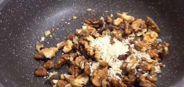 把生核桃和白芝麻一起放入炒鍋中,不要加油,中火幹炒出香氣。