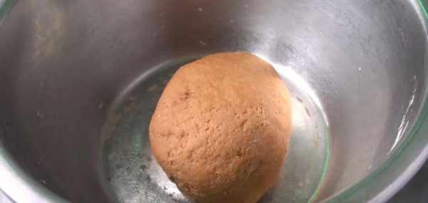 10分鐘以後把酵母水倒進幹料裡面,攪拌成棉絮狀,然後下手和面,把所有粉末揉成一個光滑的面團。