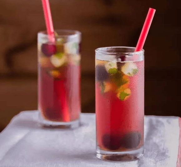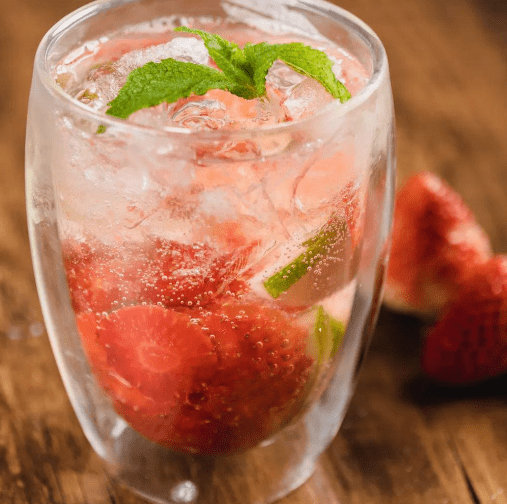 用料:2個草莓、2片薄荷爛搗成泥狀,加入50ml新鮮檸檬汁和適量蘇打水。