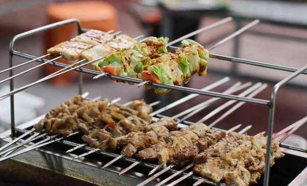 於是就放開吃,飯桌上除瞭豬肉串羊肉串之外,還有烤雞爪烤雞翅以及各種烤菜。光著滿滿一大桌的烤肉就讓人流口水啦。但剛剛端上來的烤串是不能直接吃的。大部分都是六七分熟的。需要放在小的烤爐上再烤一會兒。這個小烤爐在很多地方不常見。隻有在淄博才能吃到這樣的烤串。雖然是一個小烤爐。但是他中間放著一盆涼水,兩邊才是碳。這樣烤制的過程中就不用擔心有濃煙冒出來啦。
