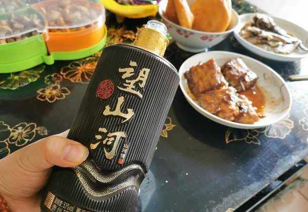 烤串烤完後,然後再蘸著自己喜歡吃的蘸料。直接卷著小餅吃,甭提有多美味瞭。除瞭吃燒烤之外,江西的這六人還帶瞭自己喜歡喝的白酒。這款白酒屬於濃香型的醬香酒啦!它的名字叫做望山河。