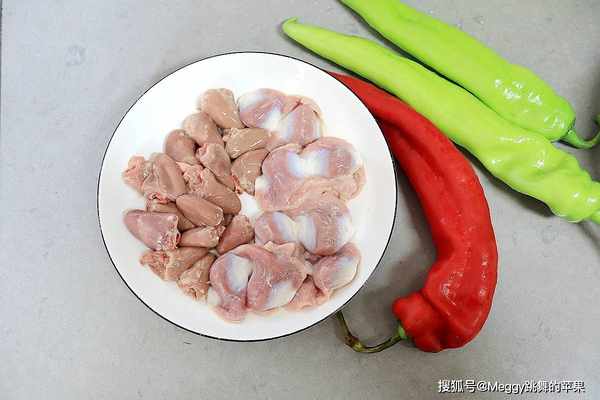 1. 備料:剪掉雞心上的“護心油”、擠掉內部的血塊,雞胗內外刮洗幹凈,青紅辣椒用量不限;