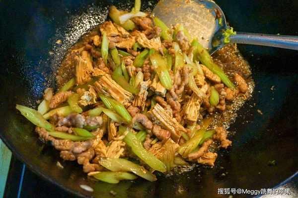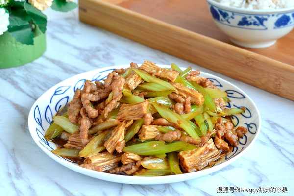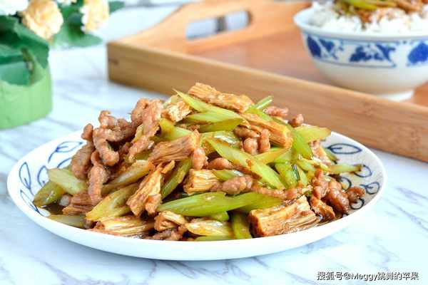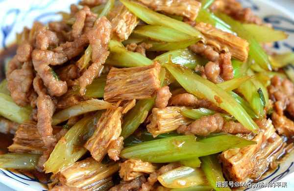 腐竹是豆制品,口感筋道,含豐富的蛋白質、鈣、磷等營養素,涼拌、熱炒都不錯。芹菜富含維C、胡蘿卜素、粗纖維。這道肉絲炒芹菜腐竹,肉絲嫩滑,芹菜清脆,腐竹軟彈,每一口都香濃爽脆,芹菜特殊的的清香更讓人食欲大開。