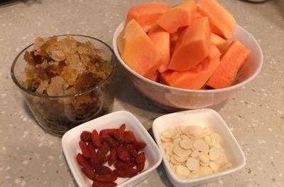 做法:1.·先將桃膠用清水浸泡半天,浸泡後會有些雜質浮出來,把雜質、黑點等清洗幹凈!(圖左上方為已發泡好的桃膠,份量會大幾倍的!)·把木瓜洗凈去籽去皮切塊!
