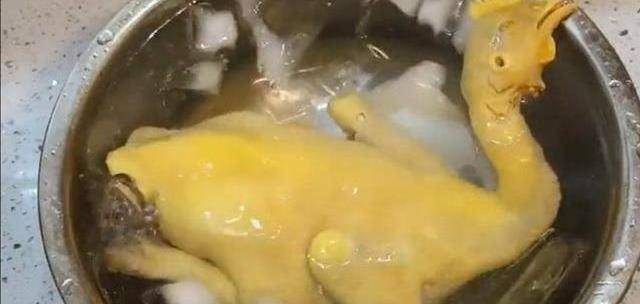 3.提前準備好的一盤子冰水,把浸熟的雞提出,放入冰水裡面,浸泡3分鐘後,撈出瀝幹水分: