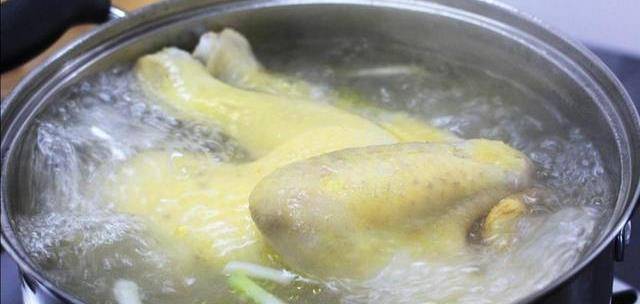待鍋裡的水沸騰時,抓住雞頭把雞放入鍋裡,浸泡10秒左右,提出瀝幹雞腔裡面的水分後,再把雞放入,反復這個步驟3次。這樣做的作用是為瞭雞皮能夠收緊,在浸雞時,雞皮不容易破裂,同時還能使雞腔裡外受熱更加的均勻。