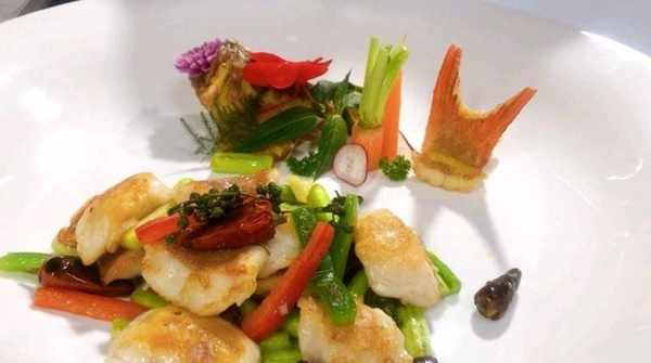 東星斑一條、鮮花椒、辣椒幹、蘆筍、青紅椒條、小炒料、雞蛋白、鹽、糖、味粉、雞粉
