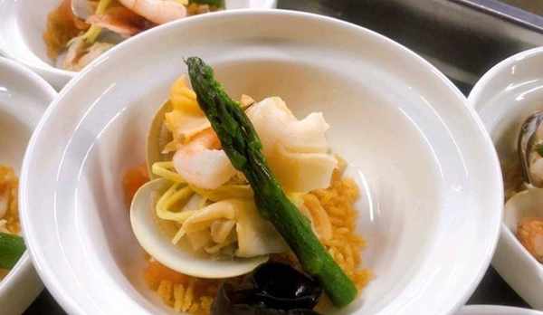 象拔蚌片、沙白2個、濃湯100克、去皮番茄丁50克、河蝦仁、香芹粒、黃金炸米10克、蘆筍尖一根、雲耳、薑絲、鹽、雞汁