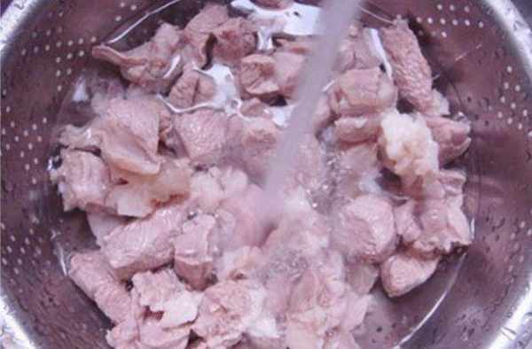 1、 將羊肉洗凈,切成塊,加料酒醃制十分鐘,再用沸水焯一下撈出,瀝幹水分;