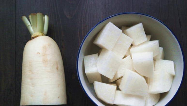 2、 同樣將蘿卜也切成塊,用沸水焯一下撈出。