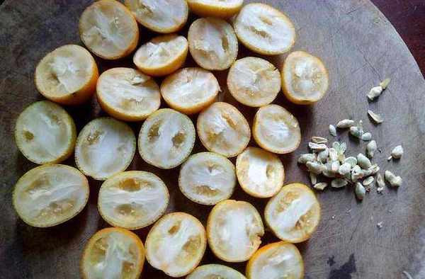2、金桔洗好之後把它對半切開,取出金桔裡面的籽。(金桔的籽有苦澀味,為瞭孩子喜歡吃,要先去掉籽,如果是大人吃,可以留著金桔籽,止咳效果會更好。)