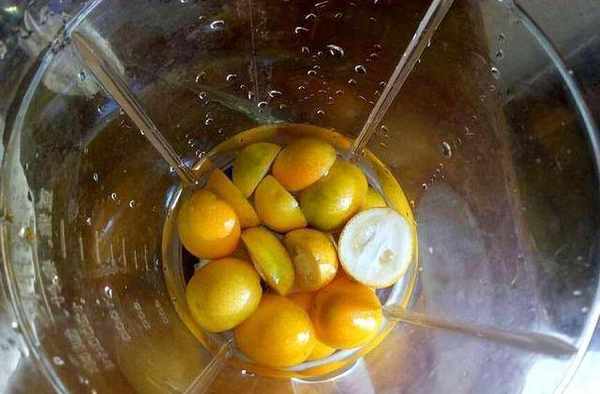 3、金桔切好之後,裝入榨汁機,或者是豆漿機中,再加入少許的清水打成金桔醬。