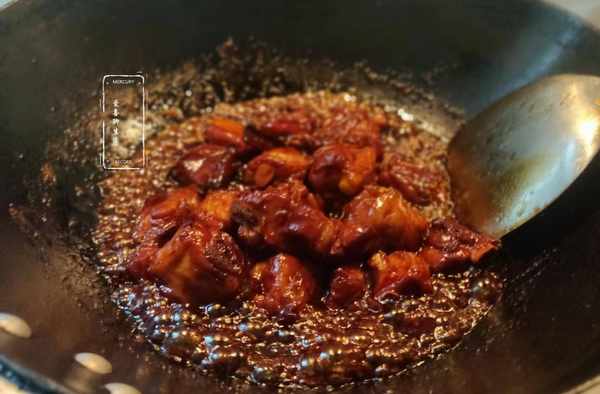 第五步,收汁。20分鐘後,肉質已經軟嫩,轉大火,加入2勺香醋,1勺白糖,半勺食鹽,提鮮收汁。