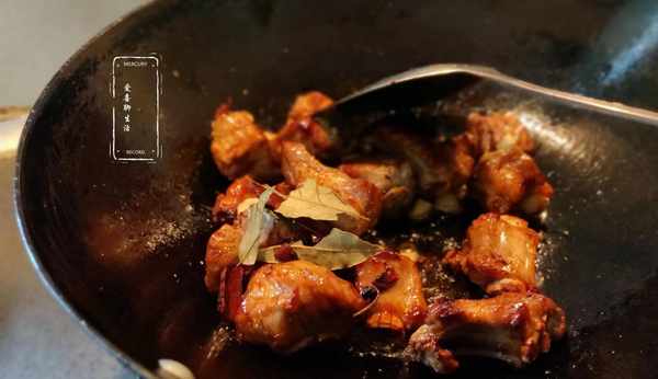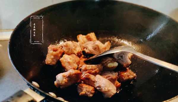 第二步,炒糖色。鍋中加入1勺食用油,油熱放入冰糖,炒至冰糖顏色變成暗紅色,倒入控幹水分的仔排,翻炒均勻。