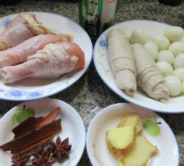 原料:琵琶腿、面筋、鵪鶉蛋、啤酒、桂皮、大料、薑片、鹽、老抽、黃冰糖。