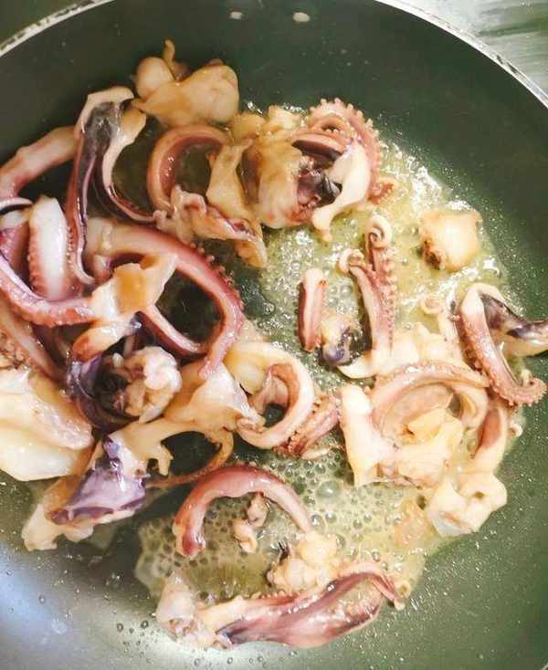 步驟5:炒薑片後,取出魷魚,在鍋裡炒。在此步驟中,不要讓醃制的醬汁。