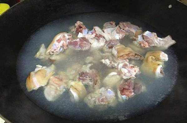 4.豬手去毛,洗凈,放入沸水鍋中焯燙。變色後撈出,洗去浮沫,瀝幹多餘的水分。