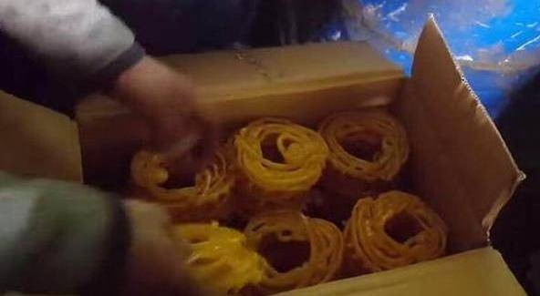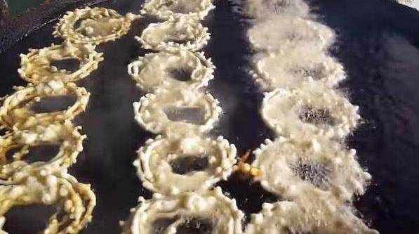 農村大爺做的這道小吃看起來非常的有食欲,吃過的人都說好吃,每天準時出攤,來賣的人非常多,每天做出來的都能賣光。大爺說這種小吃是面粉做成的,把面粉裝進盆裡,然後往裡面放入雞蛋調成面糊。再把面糊裝進一個漏鬥裡面,用漏鬥漏出來的面糊在鍋裡畫圈,炸到變成金黃色就做成瞭。吃起來又香又脆。大爺說他一天收入700多塊。