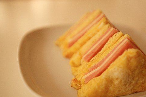 2、放上奶酪,再放兩片火腿,蓋上另一片吐司。