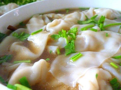 5、湯鍋中的水再次燒沸後,放入餛飩,用漏勺攪勻防止粘底,保持中火,湯煮沸後淋入100ml左右的涼水,繼續煮,直到沸騰後再次淋入涼水,至少加入2-3次涼水後,餛飩皮變得透明柔軟即可出鍋,稍稍瀝幹水分,盛在汁中,根據自己口味淋入適量油辣椒即可。