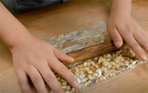 2.花生已經放涼瞭,搓一搓去皮,放在保鮮袋裡,用搟面杖壓成花生碎。