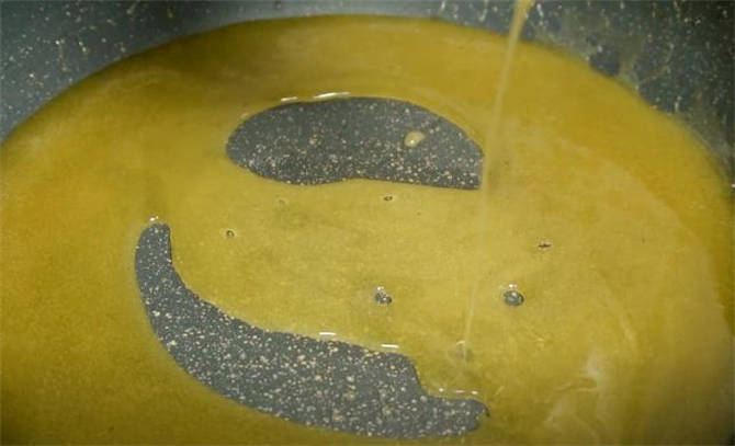 4.鍋裡直接倒入300g的白糖,開火把這個白糖熬化,開小火不停把這個糖稀熬成這個琥珀色的狀態就行瞭。