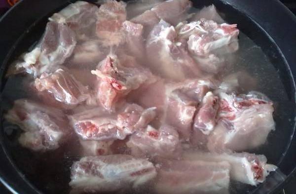 1、排骨剁成小塊,洗幹凈後瀝水。鍋中加入涼水並放入排骨,水開後撇去浮沫,煮2分鐘左右撈出瀝幹水分備用。