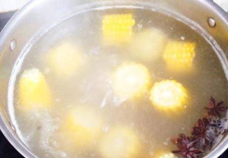 4、鍋中加入適量清水(清水一定要一次性加足,中途不要再加涼水,不然會影響口感),水燒開後放入排骨和玉米,再加入花椒和大料粒、薑片及適量料酒。用小火燉1個小時左右。