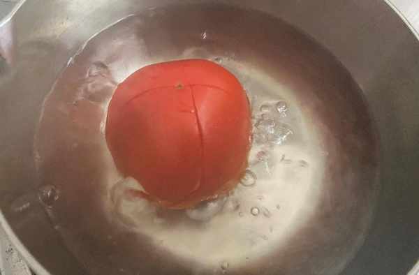 2. 番茄底部劃十字花刀,然後放到85℃的熱水裡面燙3分鐘,然後去掉皮,再切成小拇指的粒,備用。