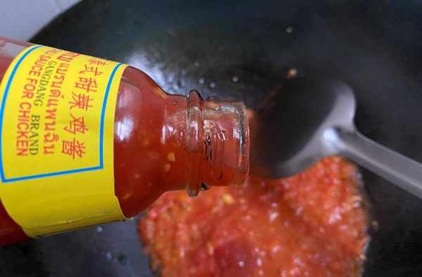 5. 再加入泰式甜辣醬翻炒均勻,然後加入鹽和適量水煮開。