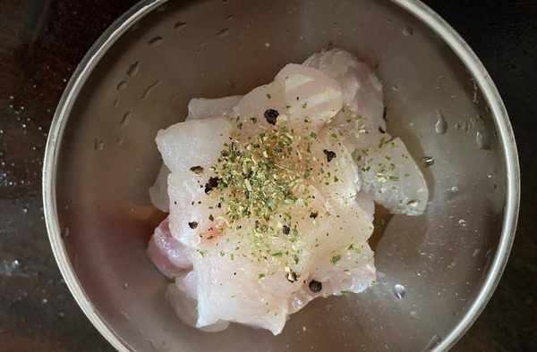 1. 龍利魚柳解凍後,切成指甲大小的粒,切粒後用先用廚房紙吸幹凈多餘的水分,再加入胡椒粉、薑蔥蒜粉、鹽、檸檬汁醃制5分鐘。這個時候可以把豆腐也切成跟龍利魚大小的粒就好。