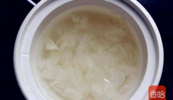 3.將銀耳放入電燉鍋中,加入一倍多的水,燉煮一個半小時。