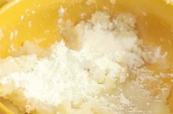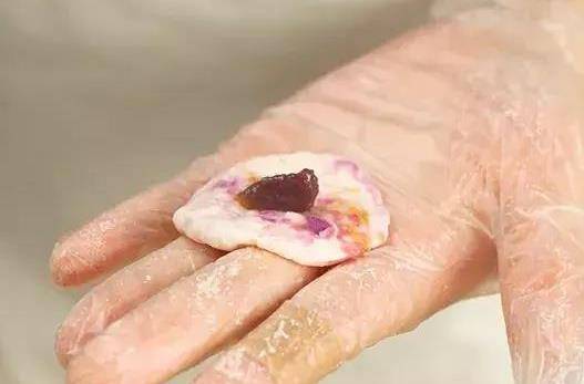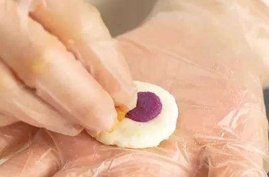 4,取適量山藥泥捏扁,混合點紅薯泥和紫薯泥上色,然後包入果醬就做好啦。