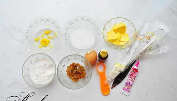 食材:低筋面粉100克,細砂糖100克,檸檬皮屑適量,雞蛋120克,黃油100克,泡打粉3克,香草精少許,葡萄幹適量,各色巧克力適量。