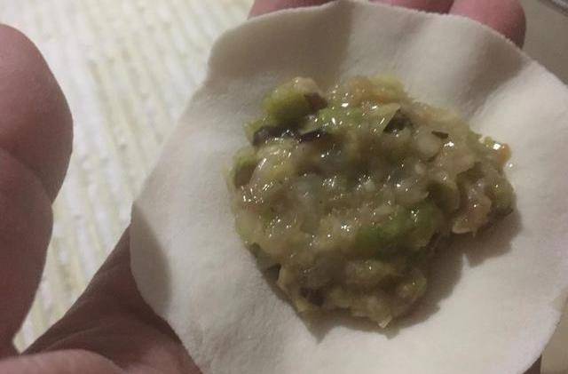 取一個餃子皮放在手中,餃子皮中間放上餡料。