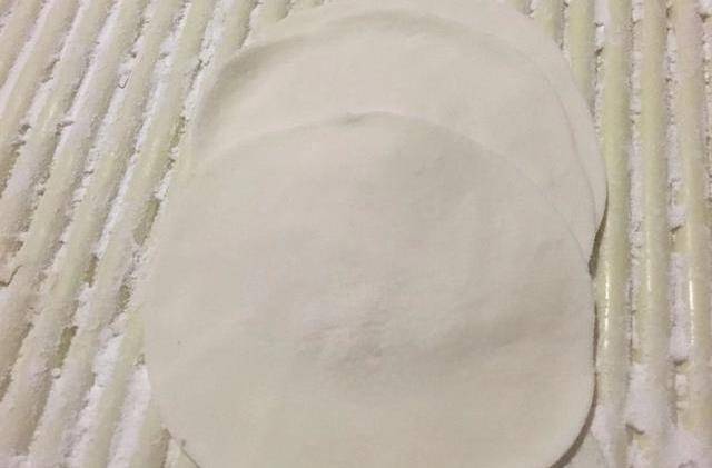 把搓成圓球的小劑子壓扁,搟成餃子皮。