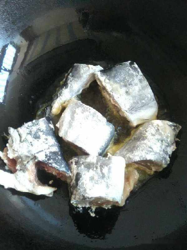 2,鍋燒熱,放上花生油,再把鮁魚段放入小火煎。